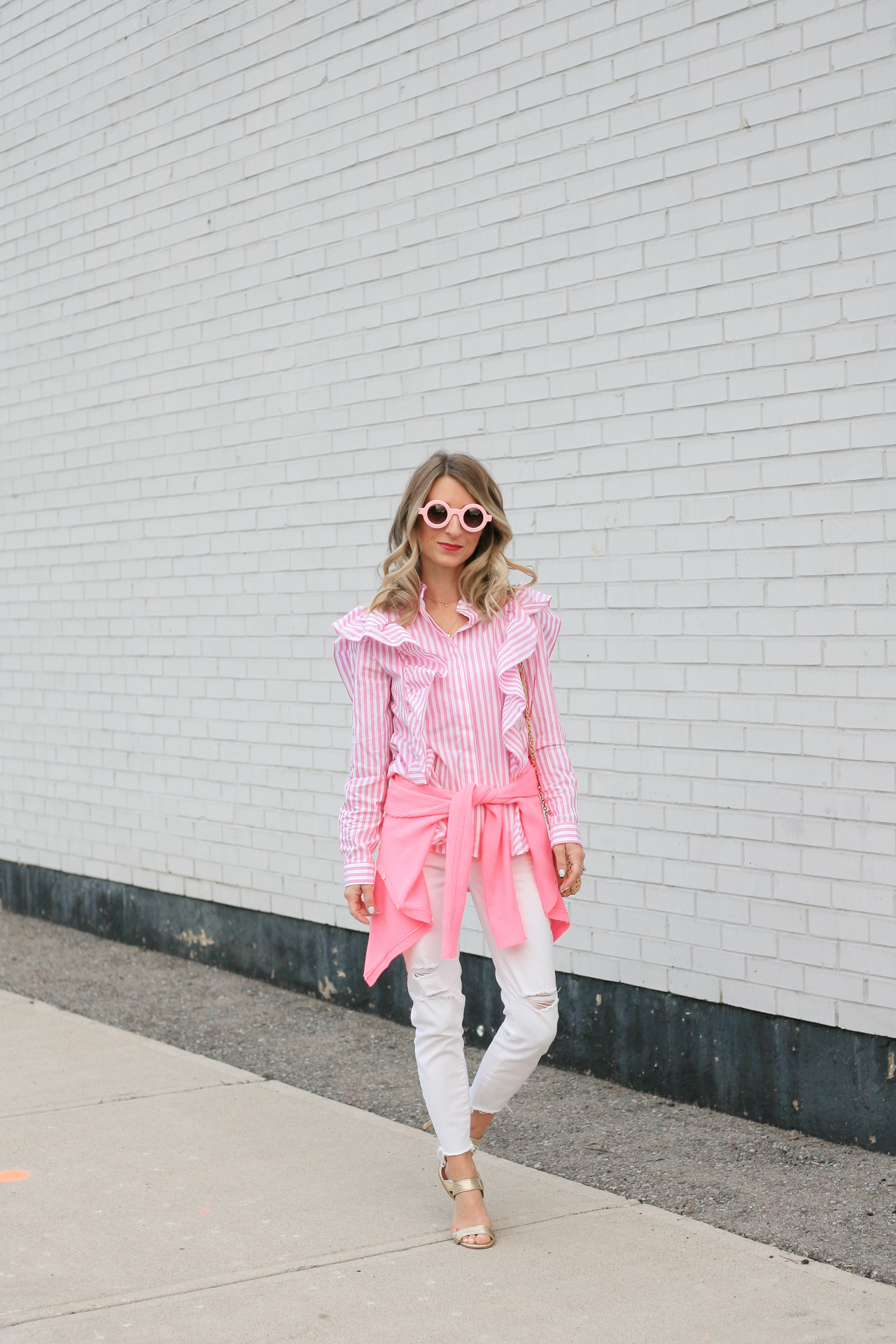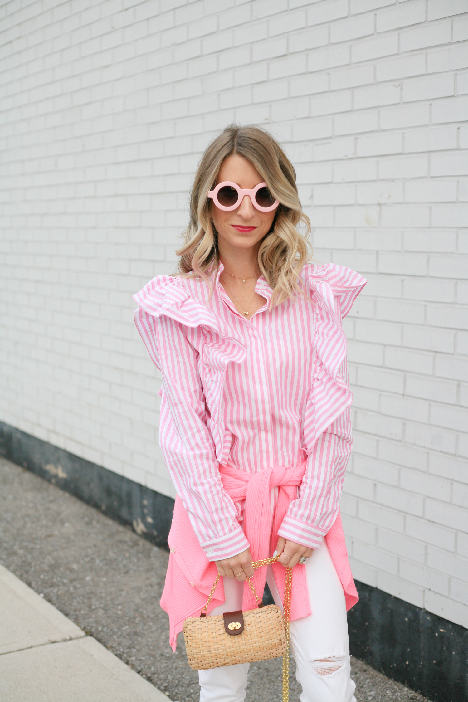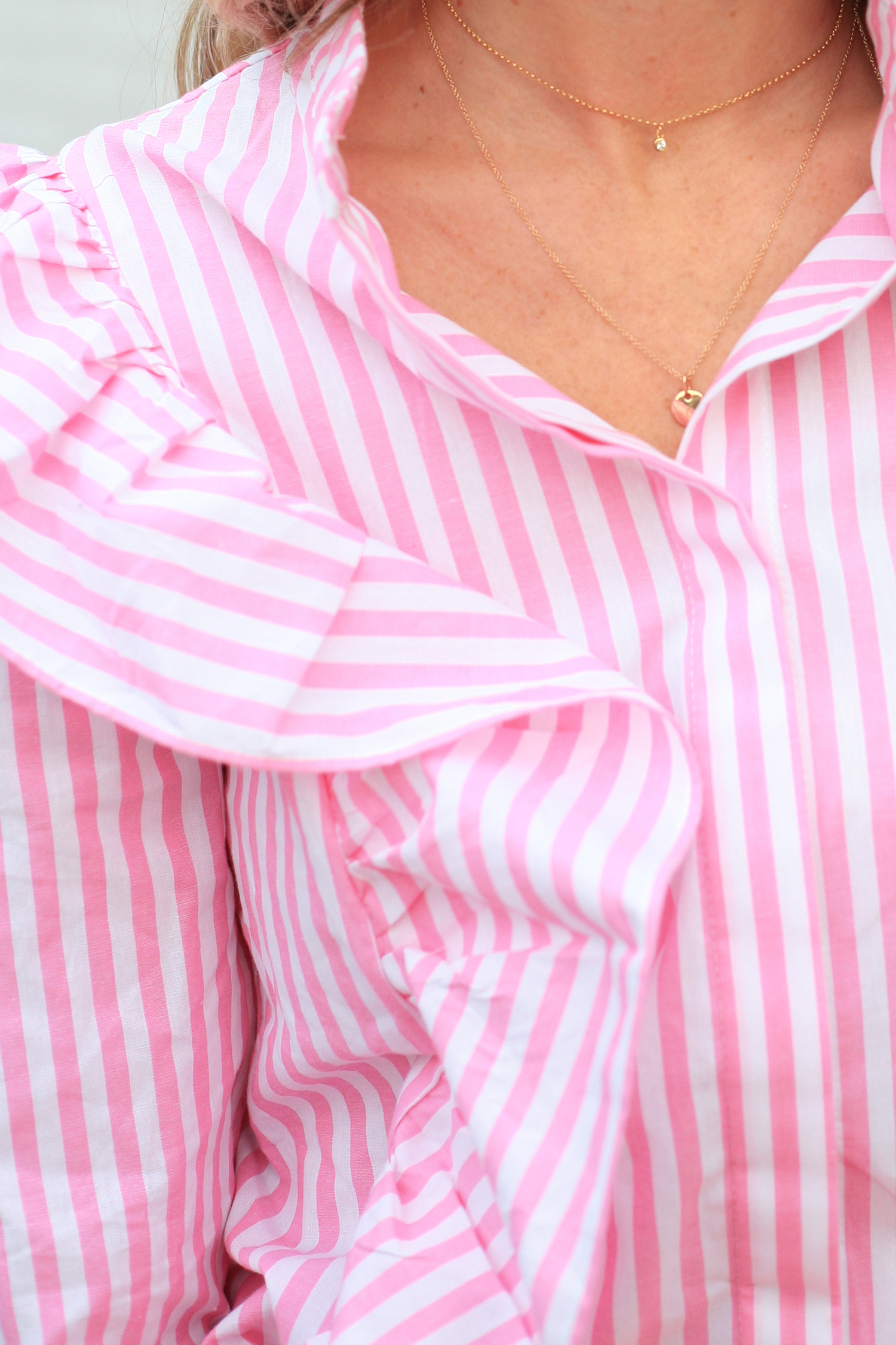 I love a good striped blouse, so when I saw this candy striped version it was definitely the missing puzzle piece in my wardrobe! The oversized ruffles are everything and will certainly add some drama to your look. It looks summery fresh paired with a crisp white pair of jeans but equally as stunning tucked into a pink or nude pencil skirt.