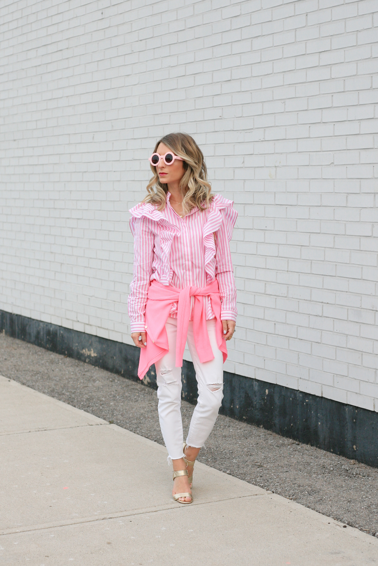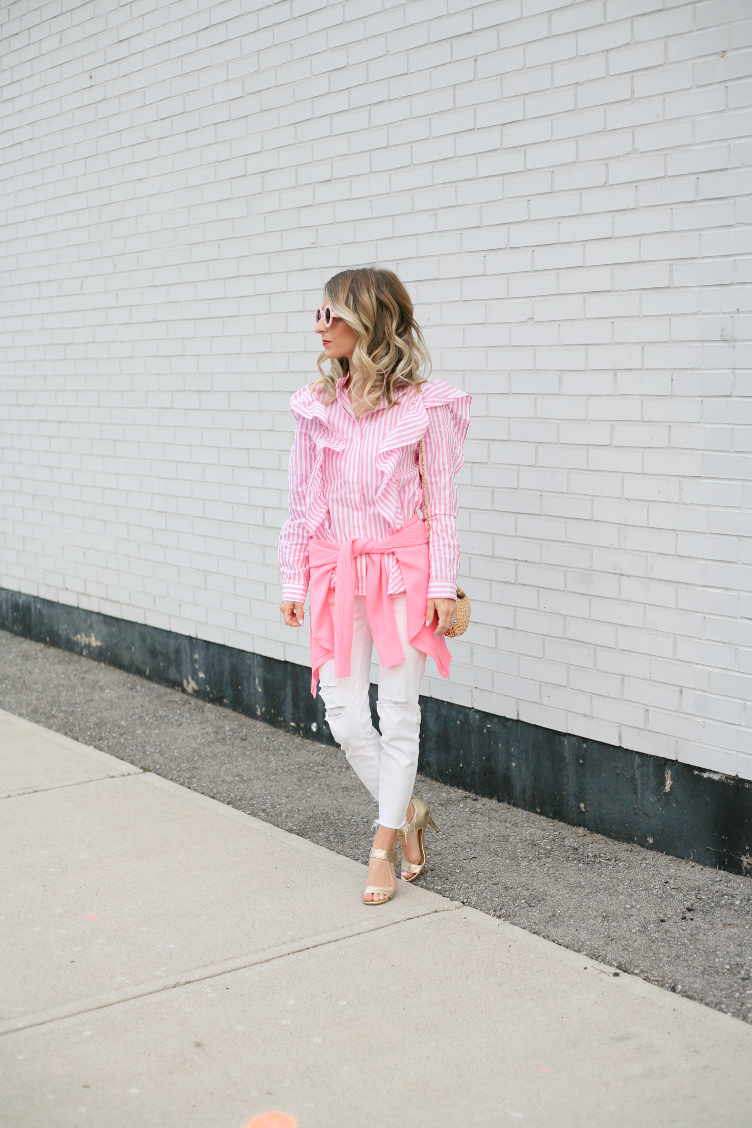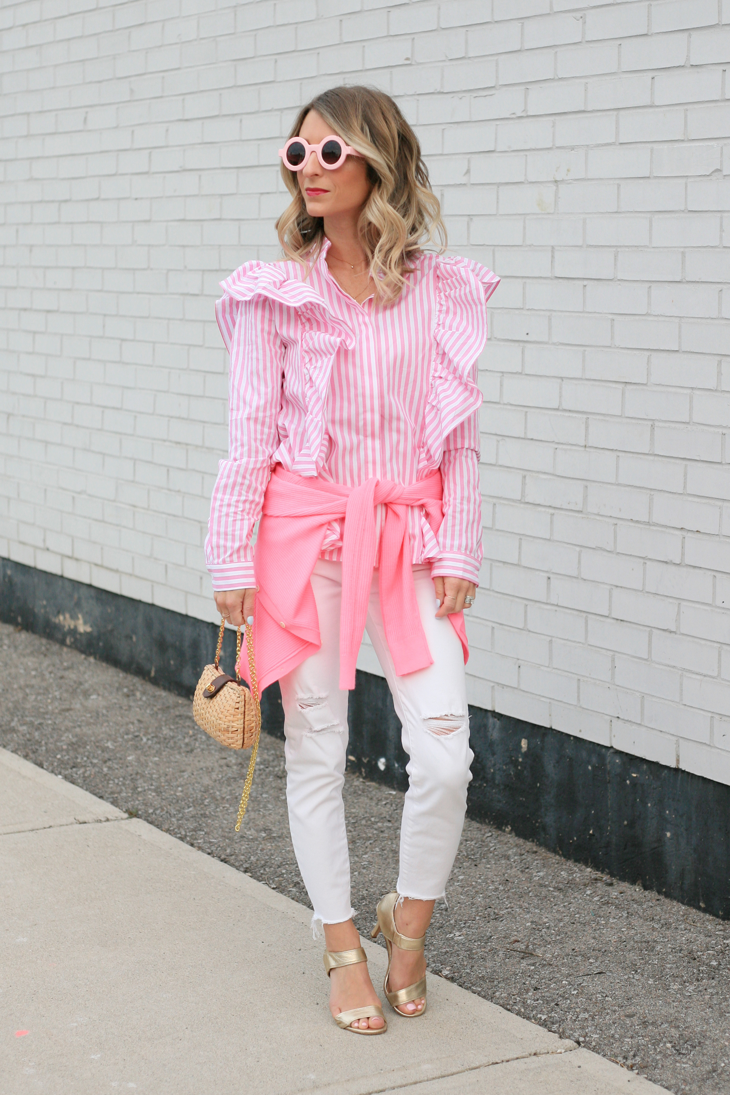 I love a good striped blouse, so when I saw this candy striped version it was definitely the missing puzzle piece in my wardrobe! The oversized ruffles are everything and will certainly add some drama to your look. It looks summery fresh paired with a crisp white pair of jeans but equally as stunning tucked into a pink or nude pencil skirt.