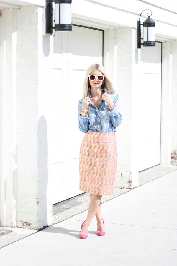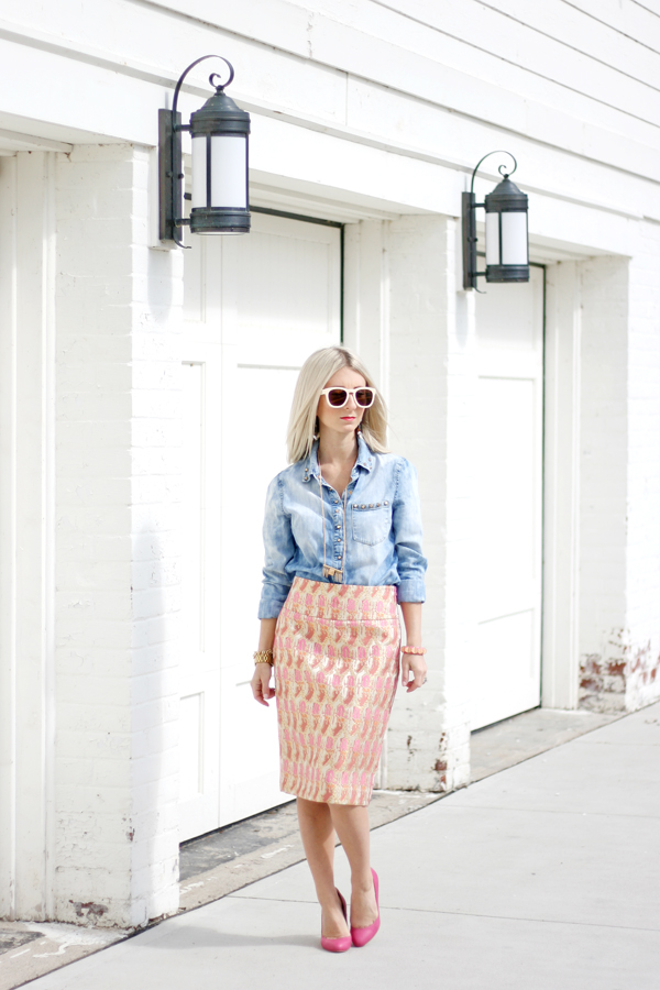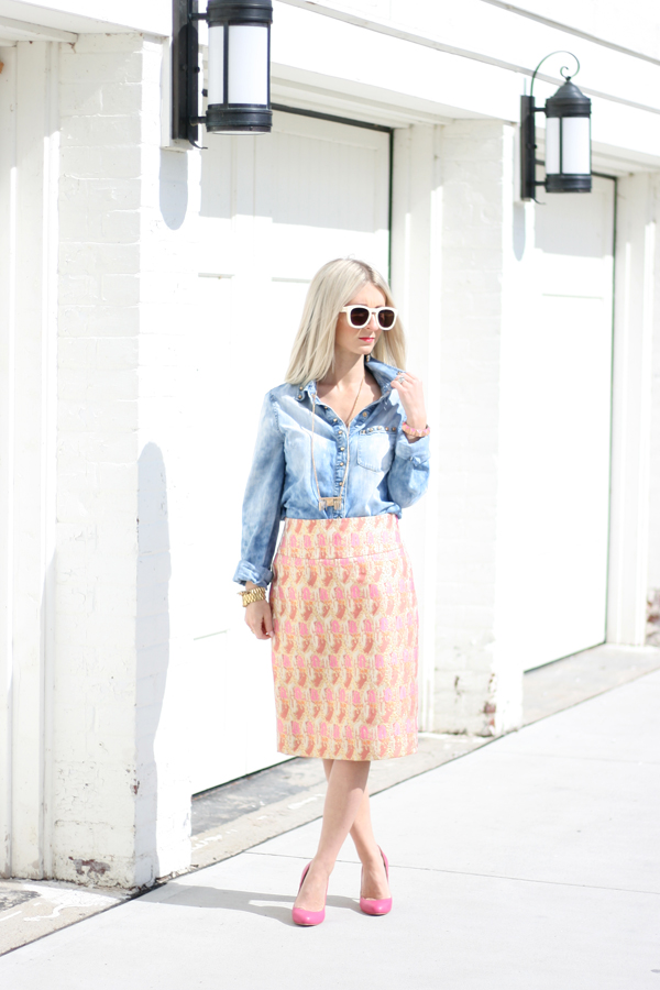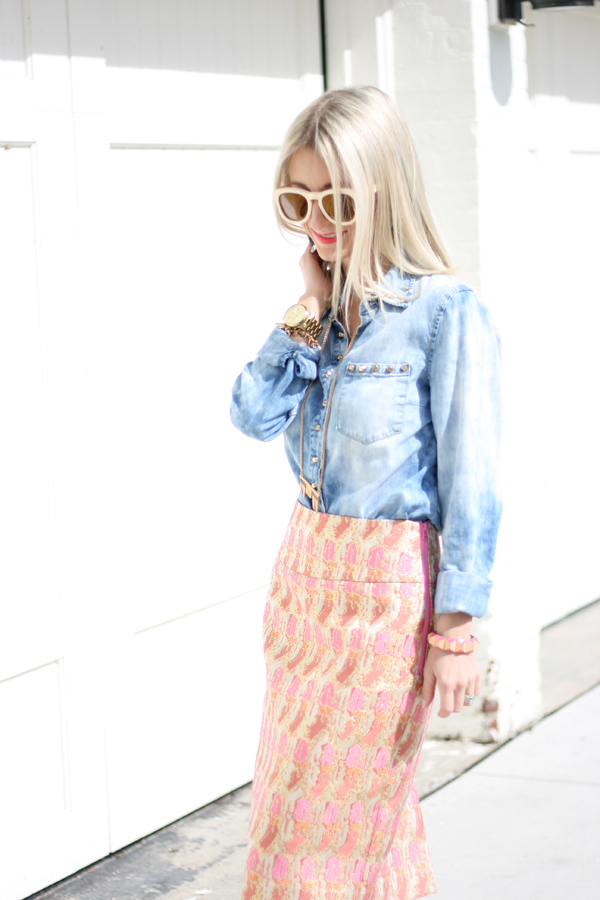 Skirt: Pink Tartan from Winners (old, similar) l Shirt: Forever21 (old, similar) l Shoes: Pretty Small Shoes (similar) l Necklace: Banana Republic (old, similar) l Sunglasses: Wildfox l Bracelet: J.Crew (old, similar) l Watch: Michael Kors l Gold Bracelet: Sparkle Jewels (similar) l Earrings: J.Crew (old, similar)